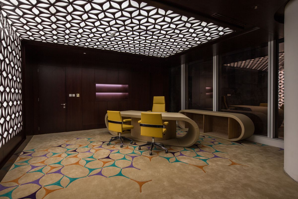 This prestigious office project in Business Bay District – Dubai spans over 5,600 square feet. Its contemporary design features light and modern colours, minimalistic yet functional furniture, and glass partitions to maximize the natural light flow in the office. In terms of space, the design is productive and inviting. The office is fit with high-end Spanish furniture, as well as special custom-made pieces. Of significance is the beautiful, carefully-crafted wooden wall for the conference and meeting room areas, as well as the unique CEO room.